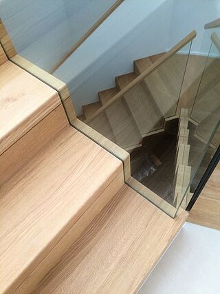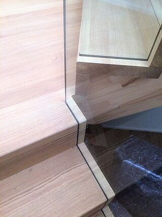 Der aufgesetzte rechteckige Handlauf aus Holz "rundet" das Ensemble hervorragend ab. Ecken und Kanten haben wohl noch nie so dynamisch und gleichzeitig harmonisch gewirkt. Die außergewönliche dreiecksförmig verlaufende Treppe hebt sich von allen anderen Modellen ab. Die Konstruktion zeugt von Kreativität und gestalterischen Mut - und dank der sauberen Holzauswahl und dem Verzicht auf sichtbare Verbindungen von hoher Handwerkskunst. Speziell die Anschlüsse an die Wände wurden sehr elegant gelöst - und tragen dazu bei, diese Anlage zu einer Siegertreppe zu machen.